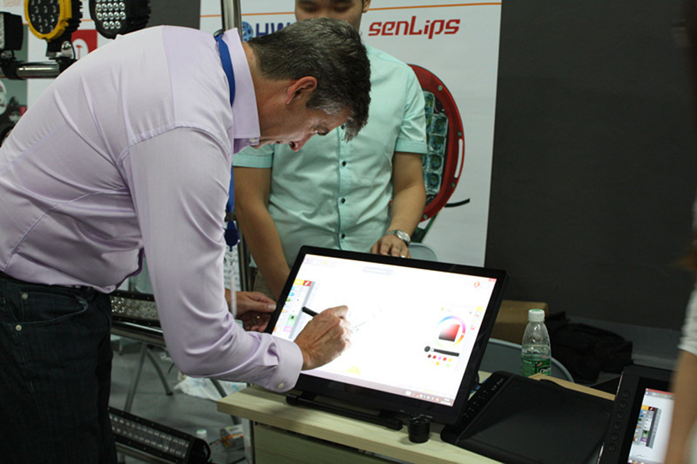 The staff at wholly-owned subsidiary of XPPEN Technology Co. in china introduced our Artist Pen Displays and Star Graphic Tablets to Sebastian Gunninghanin and Eric Broussard. Our Artist Pen Display became the best display at show with its IPS HV screen and fluent, natural feel; The Star Graphic Tablet is the ideal entry level graphic tablet with its small size and simple operation. We also introduced our newest stylus technology with a one-click toggle function. After trying our Stylus and tablet, Gunninghan spoke highly of the XP-Pen tablet design.