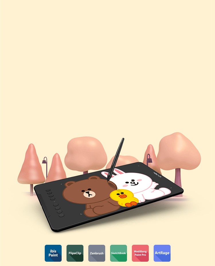 Like others in the XPPen family, this LINE FRIENDS Edition is a user-friendly tablet. It is compatible with Window PCs, Macs, and Android devices. It is also compatible with ibis Paint X, FlipaClip, Medibang, Autodesk Sketchbook, Zenbrush, Artrage, and more to help you deliver wonderful artwork.
